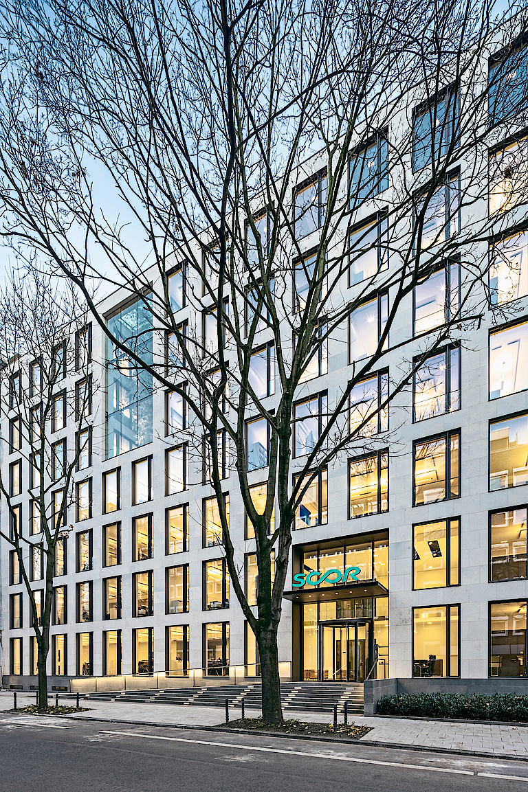 Das klar gegliederte Bürogebäude der SCOR nimmt mit zwei Staffelgeschossen die unterschiedlichen Höhen der Nachbarbebauung auf.