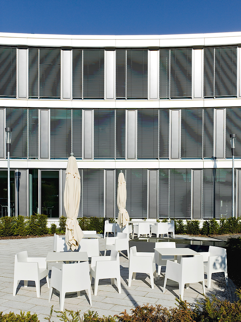 Zu den konkaven Langseiten – 2 mit schwächerer, eine mit stärkerer Krümmung – treten die 3 Schmalseiten mit ihren je doppelt schrägen, das heißt aus der Waagrechten wie Senkrechten kippenden, dann noch geteilten und versetzten Wandstücken in lebhaften Widerspruch. Rundum mit Paneelen aus Aluminium verkleidet, wird das 3 Geschosse hohe Gebäude durch einen breiten Eingangsbereich mit Vordach von Südosten erschlossen.